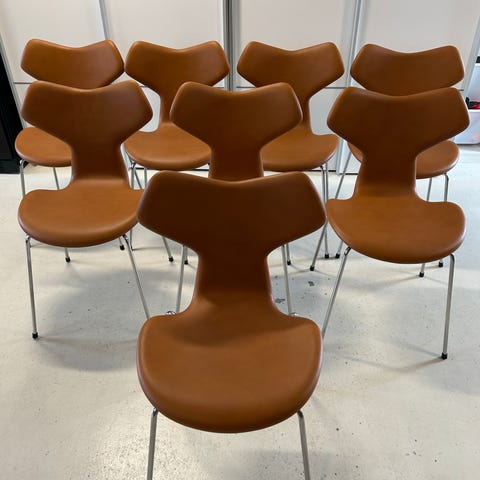 Arne Jacobsen Grand Prix stole nypolstrede i smuk cognac Anilin læder.