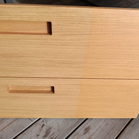 Farveforskellen mellem hvid og klar olie er ikke stor, og man kan nemt efterbehandle de andre skuffer med hvid olie for at få et ensartet udtryk.