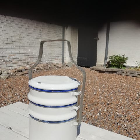 Gammel Emaljeret metal spand med låg og hank i orange farve.