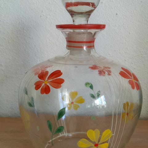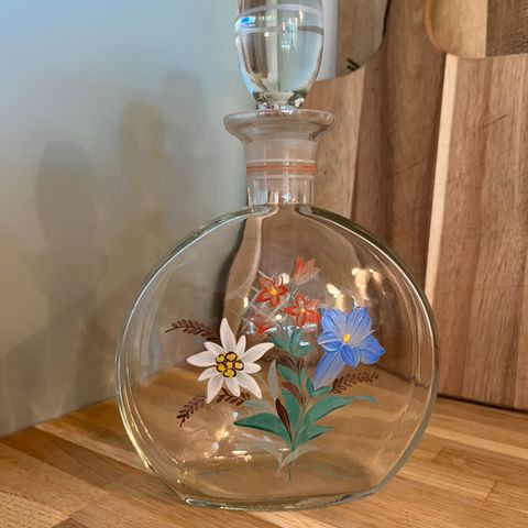 Antik Mundblæst vandkaraffel med emalje håndmalet dekoration bestående af pink blomst og grønne blade.