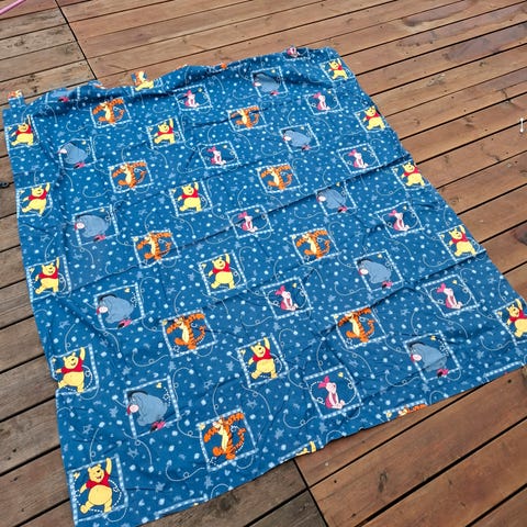 Gardinstang og 2 gardiner med motiv fra Peter Plys. Gardinstang er buet, så gardinet slutter tæt. Aluminium. Passer til vindue 120 x 120 cm. Gardinstang købt ved Gilling gardiner.