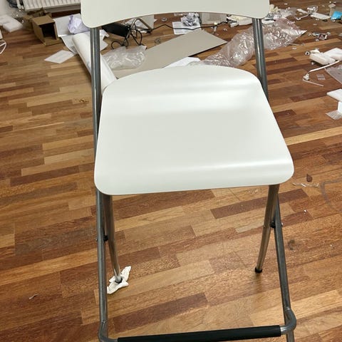 IKEA Alvar Aalto Spisebordsstol med hvidt sæde og ryg i krydsfinér. Stolen har metalben og en enkel, funktionel design. Velegnet til brug ved spisebordet.