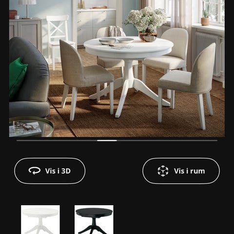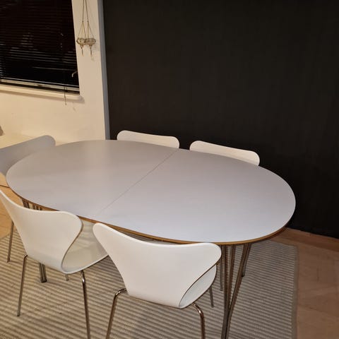 Spisebord i træ lak mat hvid, ridseresistent, 2 tillægsplader, koniske ben i krom. NYPRIS 5000,-