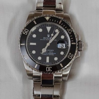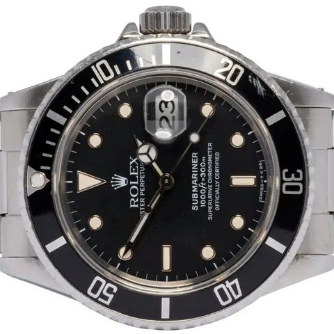 Herreur, Rolex, Model Submariner, ref. 16610. Mekanisk COSC værk med automatisk optræk og datovisning, kaliber 3135. Sort skive med hvidguldsindeks og visere. Rolex ''Oyster'' lænke af stål med foldespænde. Urets diameter 40 mm. 1996.