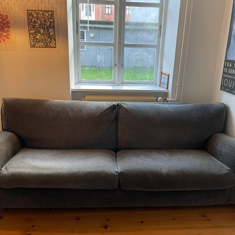 Den har et hak i ryggen bagved puderne, men det er ikke noget der har betydning for komfort når puderne er i. Og ikke noget man kan se. Det ene armlæn er lidt løst, men skal muligvis bare spændes. Heller ikke noget der har funktions betydning.