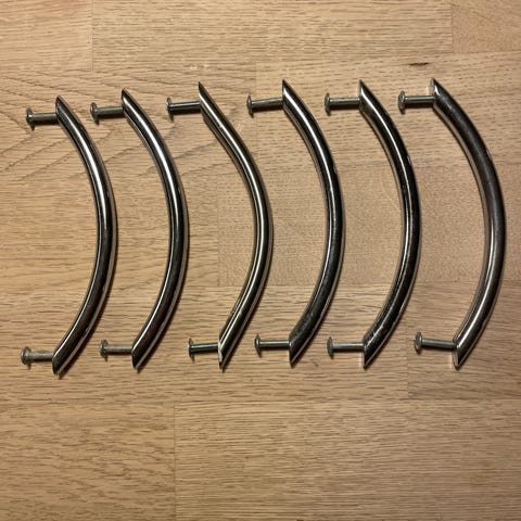 6 greb / håndtag til skuffer, kommoder eller skabs låger i metal. Passer til alle med huller fra 5cm op til 10 cm.