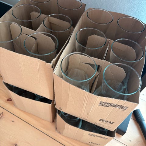 Sælger 15 stk karafler, brugt 1 gang til bryllup. Rummer 1 liter. Købt i søstrene grene. Førpris 300.