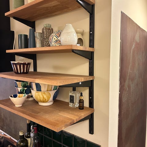 Jeg sælger også to skinner (206 cm lange) fra Bauhaus. Vær opmærksom på, at der nok vil være behov for flere skinner for at kunne hænge de lange hylder ordentligt op. Vi bruger bare selv de øvrige skinner og sælger derfor kun to.