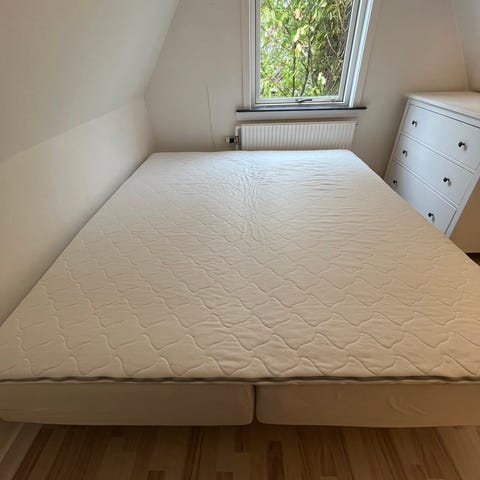 Topmadrassen er brugt med et beskyttelseslag over, med alm. brugsspor på den ene side.