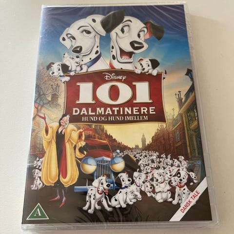 Disney 101 Dalmatians DVD film featuring the story of dalmatian dogs. The DVD is compatible with region 2 and includes languages such as Danish, Swedish, and Norwegian. It is suitable for viewers aged 7 and older. The film is presented in full screen format.