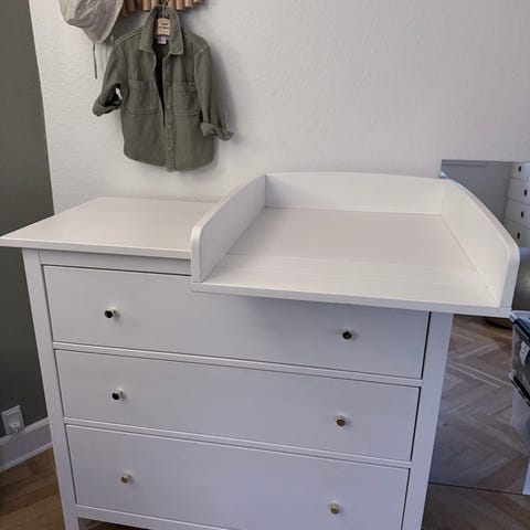 Flot og simpel puslekommode, produceret i hvid laminat. Kommoden har 3 gode rummelige skuffer som kan indeholde tøj, bleer, klude - alt det der er nødvendigt til pusletiden. Når det er slut med ble skift, kan kanterne fjernes og så har man en kommode til børneværelset - enten til tøj, eller til opbevaring af legetøj.