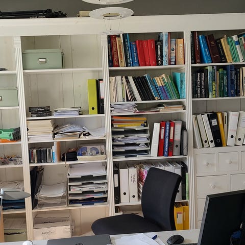 Reol fra Haslev Møbelsnedkeri. Bestående af 8 kasser. Indrettet med skuffer, hylder, vinreol og glasskabe - som ses på billedet.