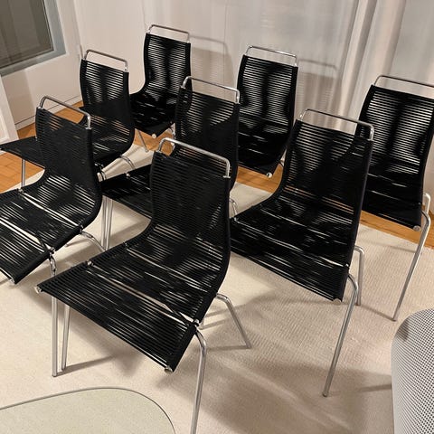 Sælger vores 4 smukke PK1 spisebordsstole produceret af Carl Hansen i klassisk peddigrør (produceres ikke længere). Stolene er i god stand, men har desværre nogle få steder, hvor peddigrørene er knækket (se billeder). Dog uden betydning for stolenes udseende og funktion - men deraf prisen. Hvis det ønskes kan de også lappes de få steder af professionel omfletter.
