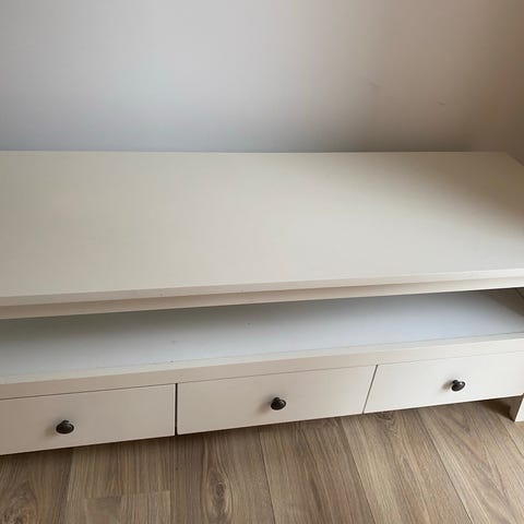 IKEA TV-bord med åben hylde under bordpladen, velegnet til opbevaring af elektroniske enheder eller andet tilbehør.