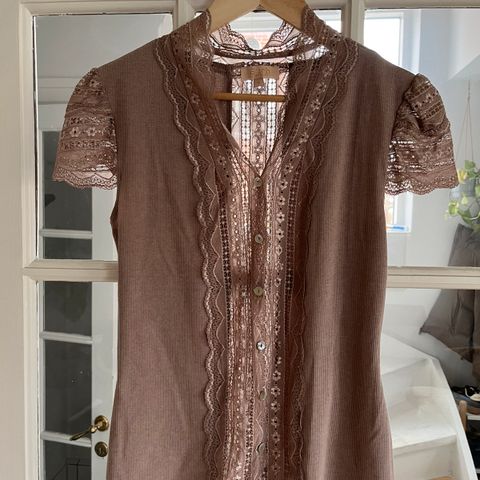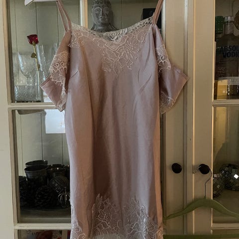 Second Female Andet lyserød kvindetøj i størrelse L. Materialet fremstår blødt med blonderdetaljer på ærmer og nederst på tøjet. Designet inkluderer tynde stropper og åbne skuldre.