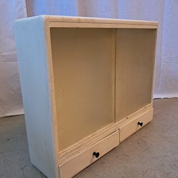 Klassisk gammelt badeværelsesskab i træ med enkelt oprindelig glaslåge i matteret glas. Vintage, retro, hyggeligt.