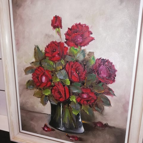 Oliemaleri, Eva Harriet Hansen, motiv: Blomster/Have, stil: Naturalistisk, b: 51 cm. h: 61 cm.