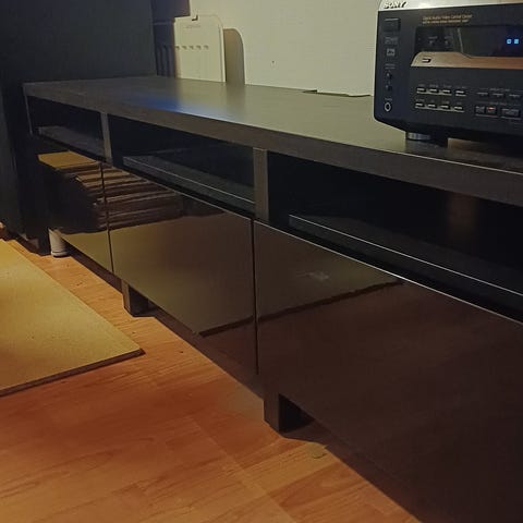 Vi sælger vores TV bord fordi vi vil gerne sætte et skab i stedet for. Fjernsynet skal også sælges da vi bruge det kun få gang om år i soveværelse.