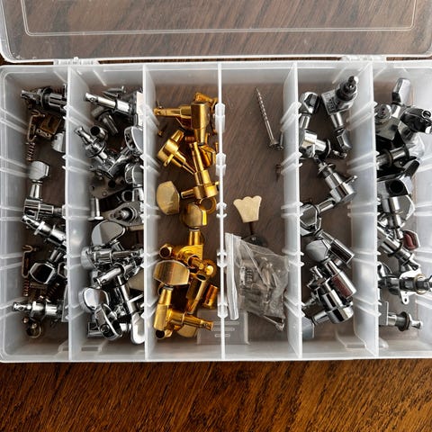 Guitarudstyr bestående af stemmeskruer og tilhørende skruer samt skiver i krom. Sættet indeholder seks stemmeskruer, seks små skruer og seks skiver. Kompatibelt til brug på guitarer til justering af strengespænding.