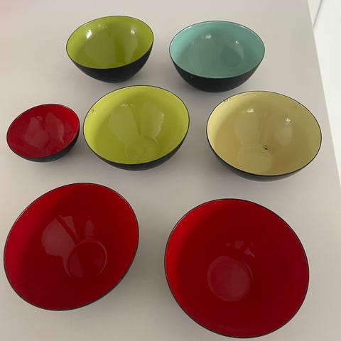 Skålenes mål er: Ø: 12,5 og 6 cm. høj og Ø: 16,0. og 7 cm høj. Der er lidt brugsspor indvendig på den store og lidt på bunden af dem. Begge dele ses på foto.