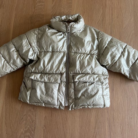 Zara unisex børnejakke i størrelse 152 i en gylden farve. Jakken er lavet af et glat materiale med en let polstring og har lynlås samt trykknapper for lukning. Egnet til børn og kan anvendes som yderbeklædning i køligere vejr.