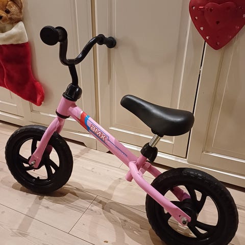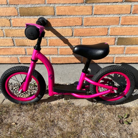 Motobecane løbecykel med 12 tommer hjul, blå og sort farve, egnet til børn. Cyklen er designet til at hjælpe børn med at lære balance og koordination før de bruger en almindelig cykel.