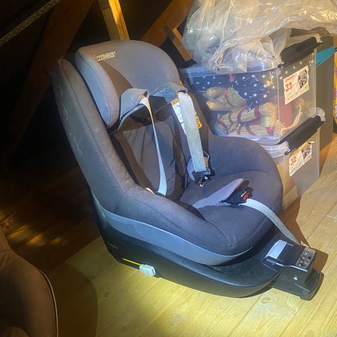 Maxi-Cosi Autostole i størrelse 18. Bilen er designet til børn og har sikkerhedsfunktioner til beskyttelse under kørsel. Farven er mørk, og materialet er polstret for komfort.