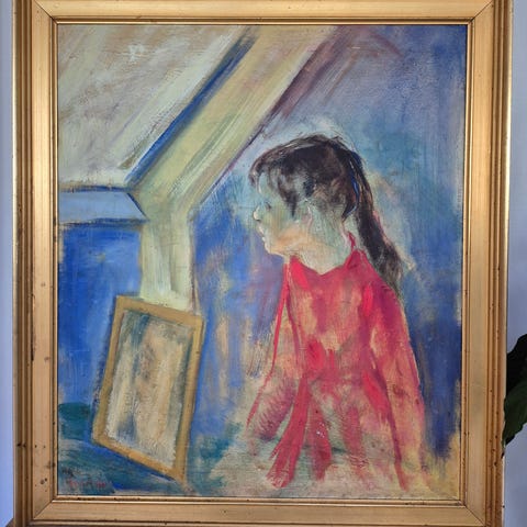 der findes flere malerier på DBA af samme kunstner. Dette er i den karakteristiske stil med noget større. Lærredet sidder let løst i ramme i den ene side og malingen krakelerer dog uden at falde af.