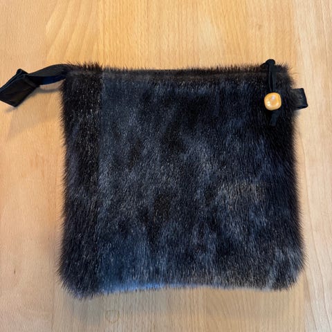 Clutch i mørkebrunt slangeskinds tryk, helt ubrugt, lynlåslomme indvendig, måler 32 x 19 cm.