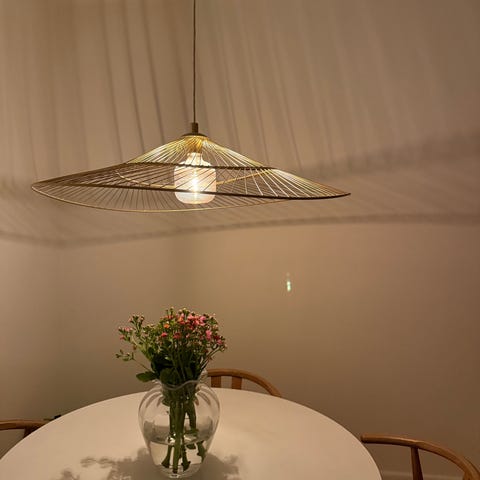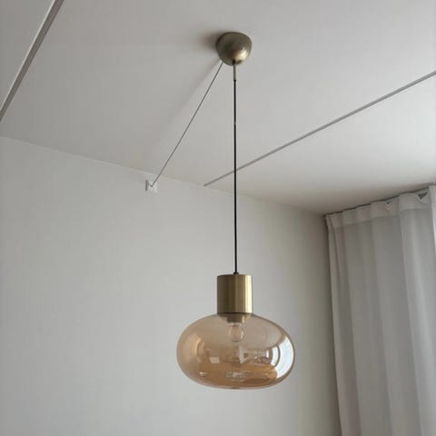Flot loftlampe i guld. Giver et varmt lys da jeg har købt alle pærerne i lav KW. Prisen er inkl. lyskilder/pærer som koster 300 pr stk.