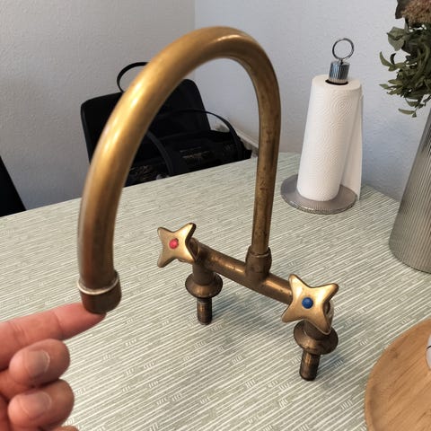Flot vintage Toni Christiansborg blandingsbatteri og håndvask i messing. Har siddet i et sommerhus og er smukt patineret, men skal videre til nogle der sætter pris på det!