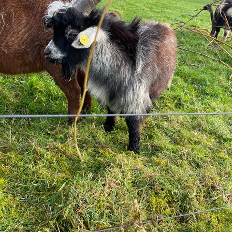 Dværgged pige fra 20. juli er nu klar for at komme fra mor, kan bruges som kæledyr da den er uden horn og vant til at gå i hundebånd. sælges for kr. 900 ring 91822012.