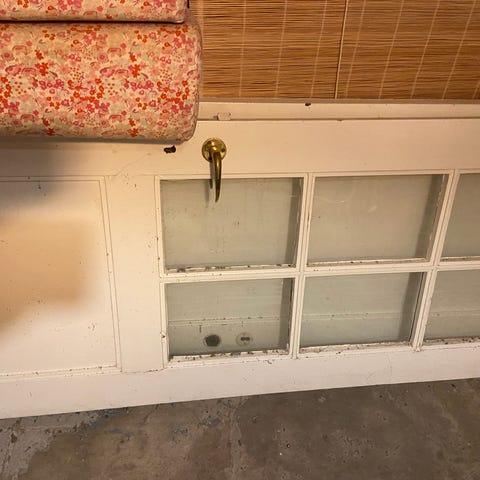 hvide dør med glasruder, som ses på billedet. Den er brugt, men i god stand og ideel til et genbrugsprojekt eller som en charmerende dør til et skur eller lignende.