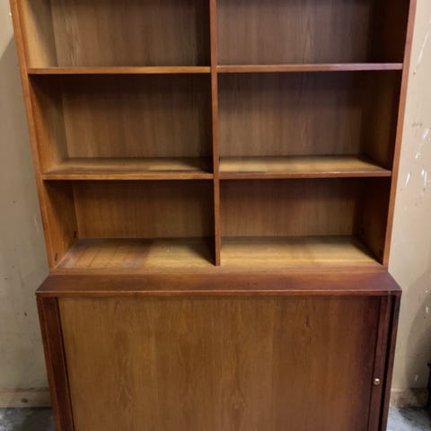 Flot skab i egetræ med jalousilåge og reol som overdel. Fremstår rigtig pæn og god stand. Overdel at tages af og er 30cm dyb.