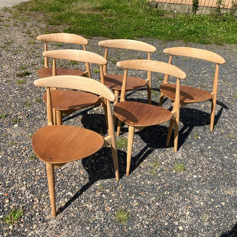 6 Sjælende udbudt hjertestole fra designer Hans J Wegner. Der var 10 stole som på billedet men i alt 6 stole tilbage. Modellen er FH4103.