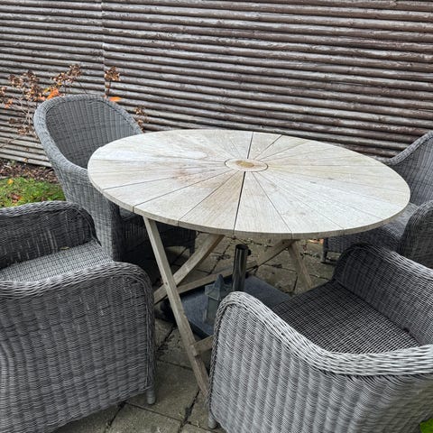 Sættet er 2 somre gammelt og har stået inde i vinterperioden. Det er desværre ikke blevet brugt så meget som jeg havde håbet på men det har pyntet rigtig fint i haven.