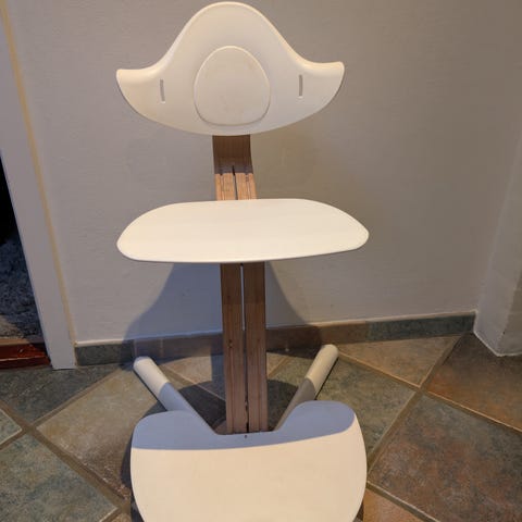 Nomi højstol i hvid og træ.. Designet til børn, justerbar sæde- og fodstøtte for ergonomisk siddeposition. Velegnet til brug ved spisebordet for børn i forskellige aldre.