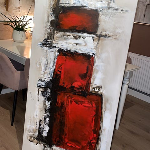 Originalt kunstmaleri af Bethina Meineche med abstrakt motiv i klare farver. Maleriet indeholder elementer som rød, grøn, blå og gule nuancer med en kombination af organiske og geometriske former. Velegnet til dekoration i moderne hjem eller kontormiljøer.
