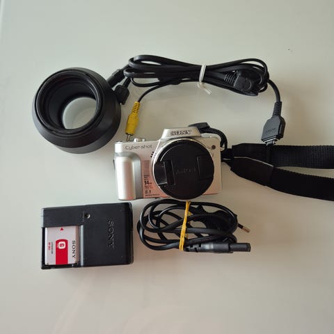 Sony DSC H2, 6 megapixels, 12 x optisk zoom, Perfekt, Zeiss objektiv. USB-kabel, skulderrem, objektivhætte, Brugsanvisning, taske og 1 GB hukommelseskort og batterier