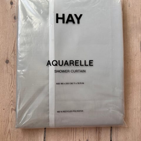 HAY Aquarelle bruseforhæng med målene 180x200 cm. Fremstillet i lyseblåt materiale. Designet til brug som bruseforhæng i badeværelset.