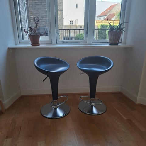 "Moroso Fjord" barstol, høj model (siddehøjde 77cm), designet af Patricia Urquiola. Betrukket med mørk-orange ("zucca" = "græskarfarvet") okselæder. Meget fin stand (ingen mærker/skjolder). Billigste netpris p.t. 10.838 per styk. Sælges for 1750/stk eller 6000 for alle fire.