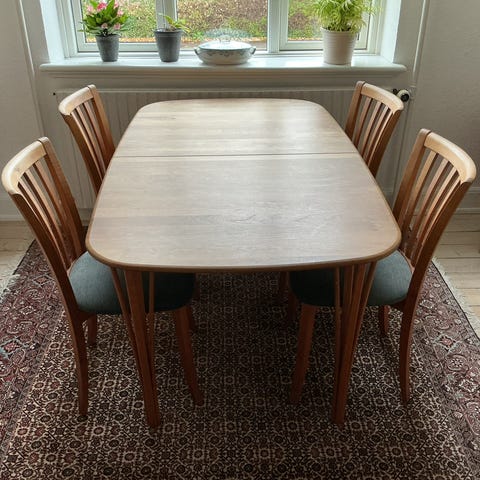 Massiv Kirsebær spisebord med udtræk i begge ender + 8 stole i massiv kirsebær med alcantara stof ( bernstofminde stolefabrik )