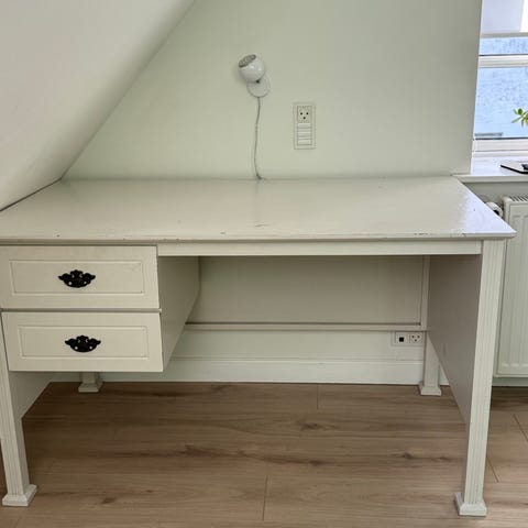 Fint skrivebord med 2 skuffer og 1 hylde, der er få brugsspor se foto