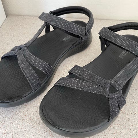 Skechers sandaler i størrelse 38 med multifarvet stofrem og sort sål. Sandalerne har en fleksibel og komfortabel sål med god støtte. Materialet består af tekstil og syntetisk gummi, egnet til dagligt brug.