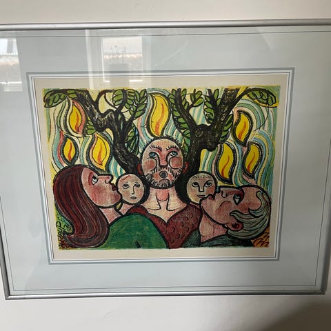 Flot tegning bemalet. Af kunstneren Paul Ditlev fra Outrup. En fantastisk tegning der skal i ny ramme. Den gør sig bedst med paspartu ramme omkring billedet. Der forgår utrolig meget i billedet. Fra 1996