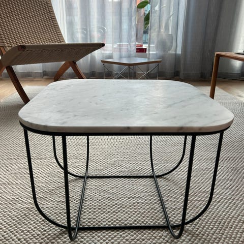 Små borde i dobbelt lakeret lys grå metal med enten Pietra Collemendina marmor eller hvid Thassos marmor. De sælges enkeltvist, de to højder kan fungere under hinanden.