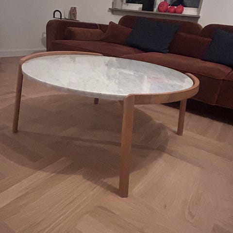 Symbiosis Square sofabord fra Bolia. Træ og marmor, rigtig flot og passer ind i det moderne hjem.