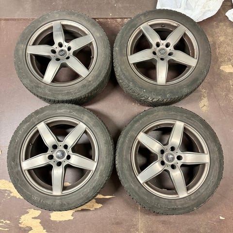 Hjulene står og skal afhentes ved Lysdahl Simonsen i Silkeborg.