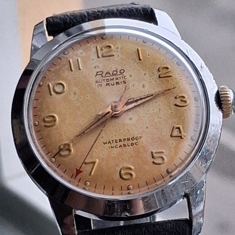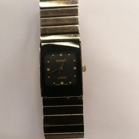 Rado Jubile med sort urskive og krystaller som timeangivelser. Uret har en sort keramisk rem og kasse, drevet af et schweizisk quartz urværk. Designet