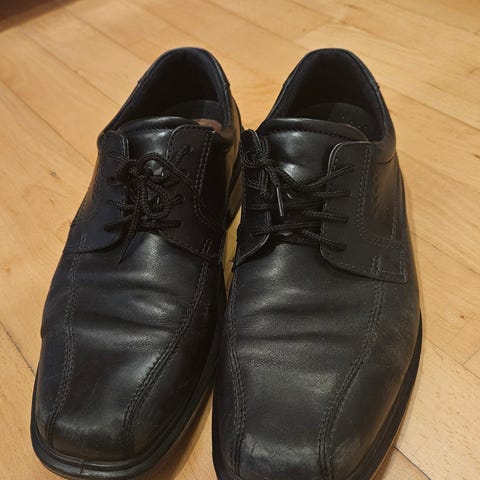 ECCO Festsko/pæn sko i, vil jeg tro, brun læder, størrelse 43 (UK-størrelsenummer: 9). Skoene har snørelukning og gummisål med mønster for bedre greb. Designet til formelle lejligheder med fokus på komfort og holdbarhed.